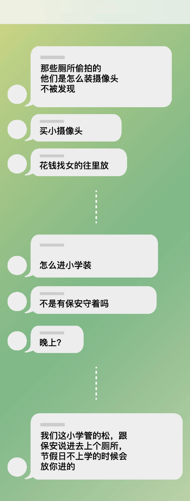 某些聊天群组专门针对年轻女孩。例如一个拥有逾6.5万成员的Telegram频道中,有人讨论在小学厕所安装隐蔽摄像头。