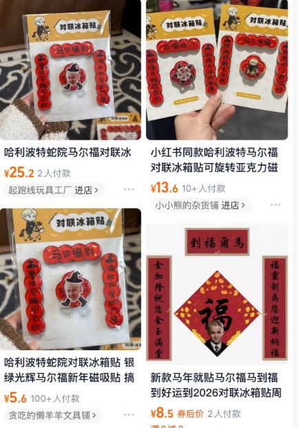 淘寶等電商平台也迅速抓住這壹潮流,推出各種馬爾福主題的新年裝飾品:貼紙、磁貼應有盡有。