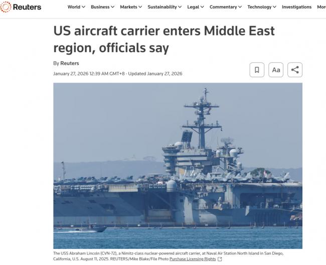 伍角大樓官員證實,“林肯”號航母戰斗群已經抵達中東,由此擴充了川普總統在中東的軍事選項,可在需要時對伊朗采取行動或保護美軍。
