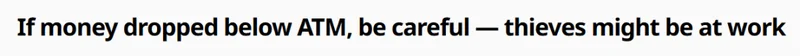 警方提醒:“分散注意力盜竊不僅限於ATM交易,犯罪分子也可能在超市或零售店排隊時竊取受害者的密碼。”