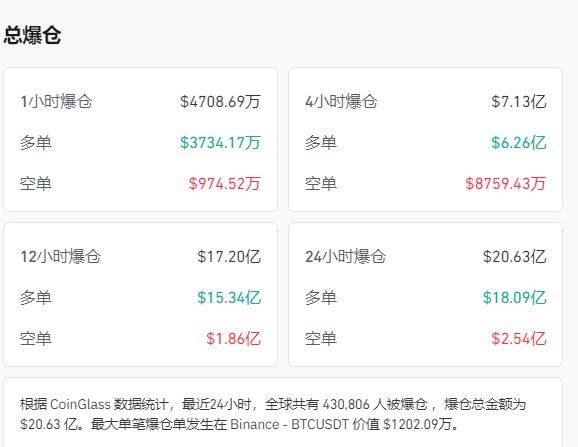 CoinGlass数据显示,最近24小时,全球共有430667人被爆仓,爆仓总金额为20.60亿美元(约合人民币143亿元)。
