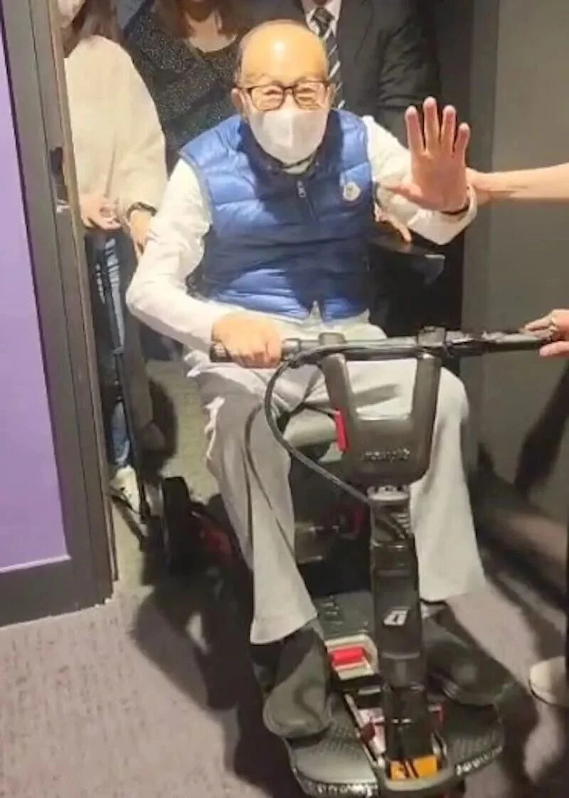 退場時,他親自操控代步車,不忘向周圍人群揮手致意。