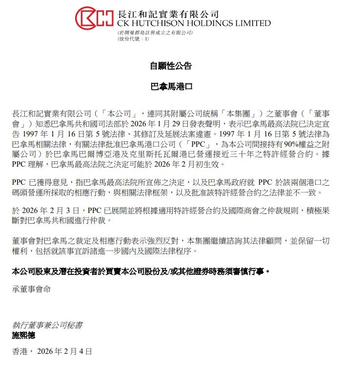 2月4日,長和在港交所公告,董事會對巴拿馬之裁定及相應行動表示強烈反對,集團繼續咨詢其法律顧問,並保留壹切權利,包括就該事宜訴諸進壹步國內及國際法律程序。