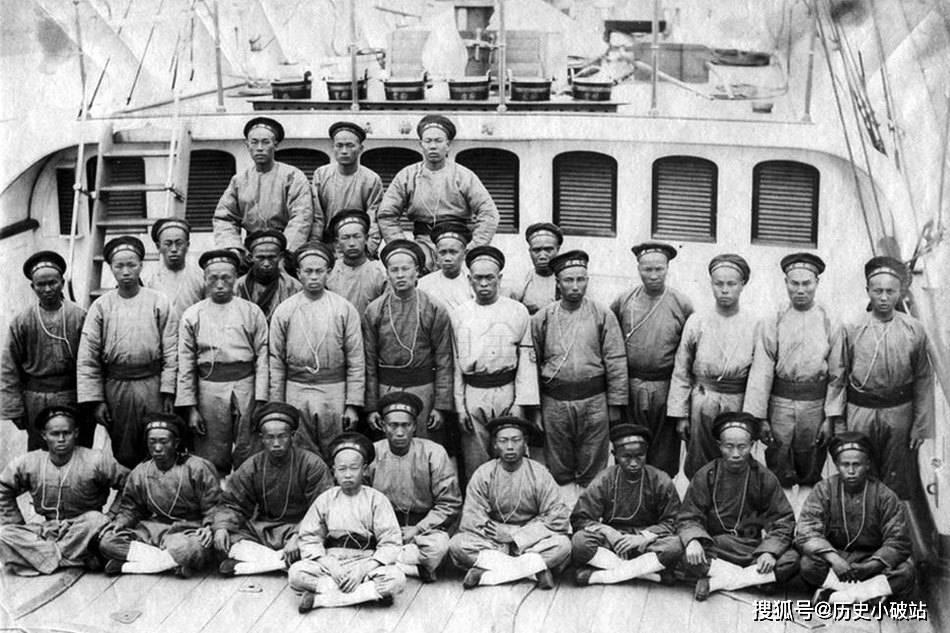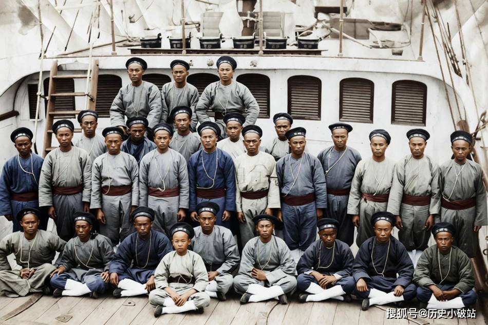 同治至光緒初年,中國海關巡邏艦“飛虎號”甲板上的水手集體合影。照片中約30名中國水手分叁排整齊排列,皆著清式海關制服,表情嚴肅而自豪。