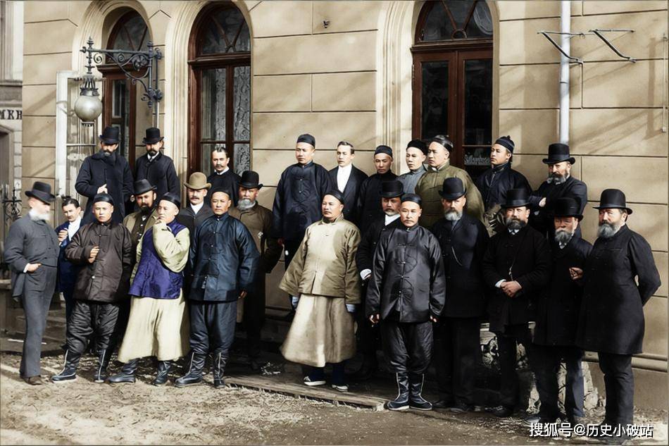 1890年,德國魯爾區埃森克虜伯公司大樓前。清朝派往德國的軍事留學生與克虜伯公司德國員工的集體合影。約20余人分排站立,前排多為中國留學生,前排右伍為段祺瑞,他雙手自然下垂,面容清瘦、目光堅定,已顯未來“北洋之虎”的沉穩氣質。其他中國留學生多為北洋武備學堂畢業生(如段祺瑞同批的炮兵生),後排為德國工程師與職員。
