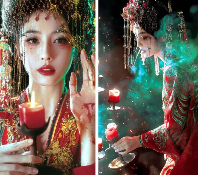 穿着华丽的唐代嫁衣,凤冠帘子半遮着脸,脸色惨白、眼神空洞,看着冰冷。