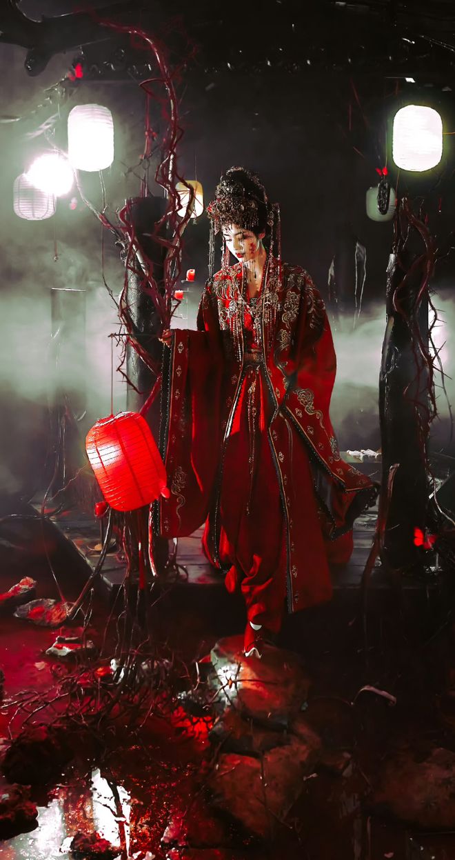 背景是灵堂感的烛台、红灯笼,飘着冷雾,红绸缠来缠去像血痕,充满中式恐怖的味道。
