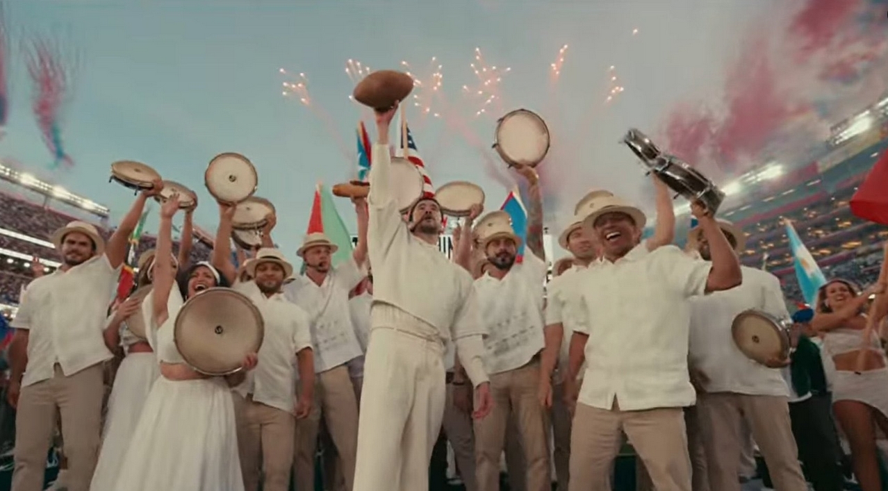 美国歌手坏痞兔(Bad Bunny)在中场秀进行了表演,他以多国人民一起跳舞的庆祝场面结束了演出,并传达了“唯一比仇恨更强大的就是爱”的信息。他还提到了所有美洲国家的名字。