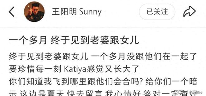 昨天(2月10日),台灣演員王陽明更新社交動態。他激動地說,時隔壹個多月終於和妻子、女兒團聚了,要珍惜每壹刻,感覺女兒Katiya又長大了。他還賣了個關子,讓大家猜猜他現在人在何處。