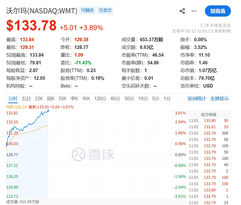 资金流向更具周期性的市场领域,沃尔玛股价大涨近4%、创新高。
