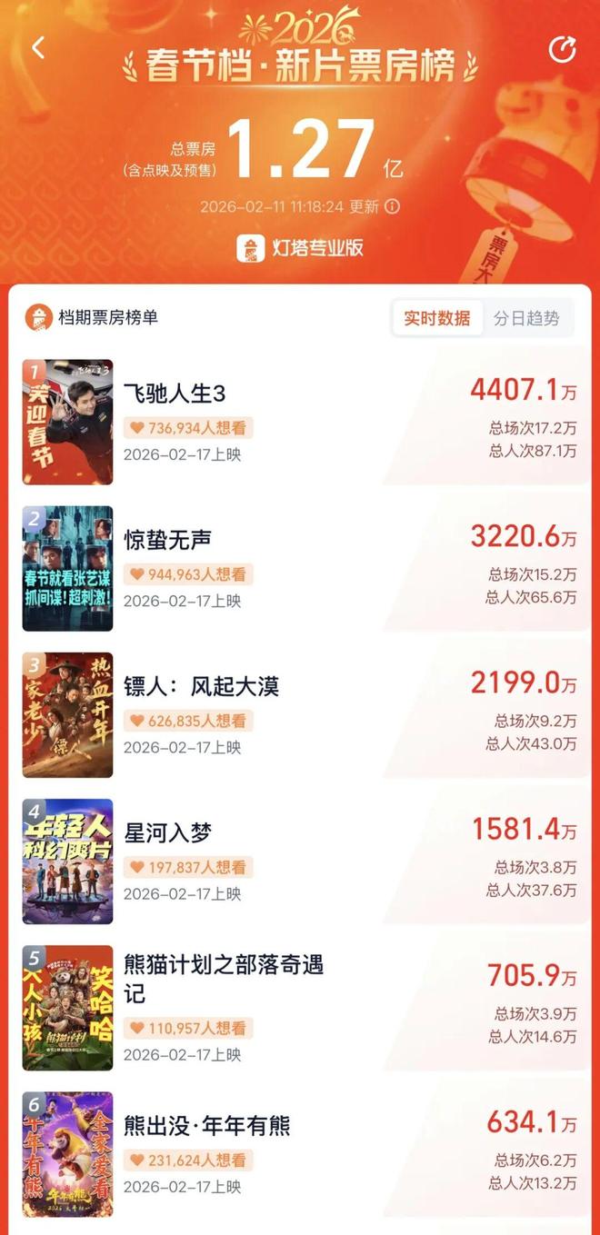 论内容多样性,这同样是相当能打的一届新片——延续热血喜剧风格的韩寒式赛车片《飞驰人生3》领跑预售,老谋子首战国安题材的新作《惊蛰无声》频上热搜,袁和平率众多打星打造的《镖人:风起大漠》备受武侠迷瞩目,韩延执导的科幻片《星河入梦》靠脑洞大开的物料掀起热议,如约而至的《熊出没·年年有熊》代表国民IP再战春节档,成龙和马丽则抱着《熊猫计划之部落奇遇记》杀入子供向市场……