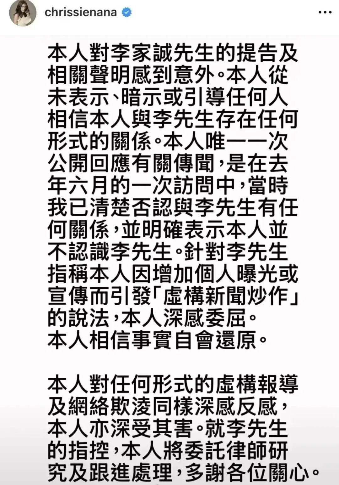 李家誠以個人名義發聲明稱,他控告周秀娜誹謗及騷擾,因她引發虛假傳聞,並強調絕不認識周秀娜小姐,與她絕無任何關系,也沒有任何企圖或意圖認識她。