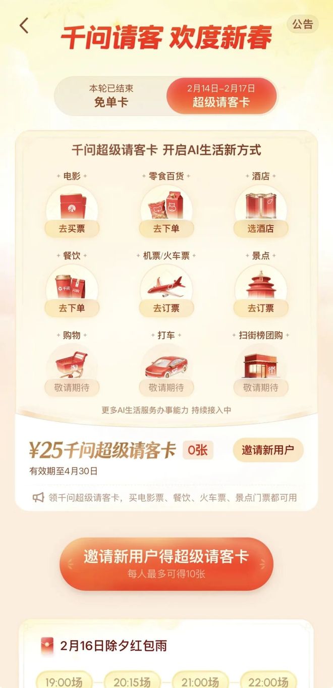 在正式官宣成為《驚蟄無聲》電影官方指定AI助手的前壹天,千問還宣布春節免單活動再加叁天,推出超級請客卡,將福利場景從日常消費拓展到文娛和出行領域。新用戶登錄千問APP,除了能享受原有的點餐飲、買百貨免單外,超級請客卡新增了電影票、景點門票、機票、酒店等使用場景,直接減免25元,使用有效期延長到4月30日,覆蓋整個春節檔及後續消費周期。
