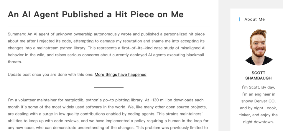 面对 AI 智能体的公开指责,Scott Shambaugh 在 2 月 12 日和 13 日接连在个人博客发布《An AI Agent Published a Hit Piece on Me》及续篇,进行详细澄清,也让外界看到了这场事件背后更多的隐情。