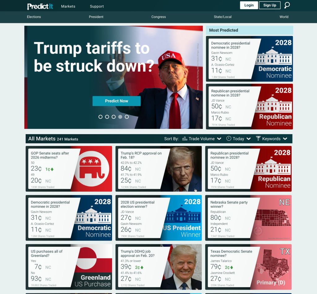 由于PredictIt介面非常方便好用,而且议题聚焦美国政治,因此在Kalshi、Polymarket等新兴平台出现之前,一直是政治预测的指标参考之一。