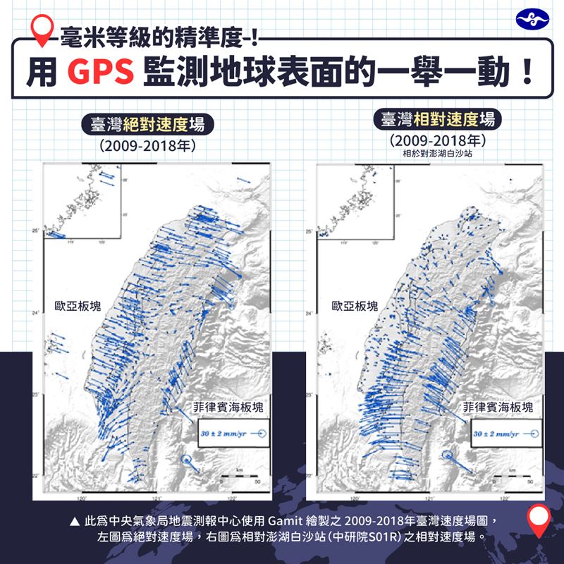 气象署PO出2009至2018年台湾绝对速度场/相对速度场示意图,显示除了地震期间,在短短数十秒内出现的“同震滑移”外,地震前、后断层也都偷偷乱动,地壳不只在地震时会动,平时地壳在“累积能量”的过程中,在地表出现非常微量的变形。