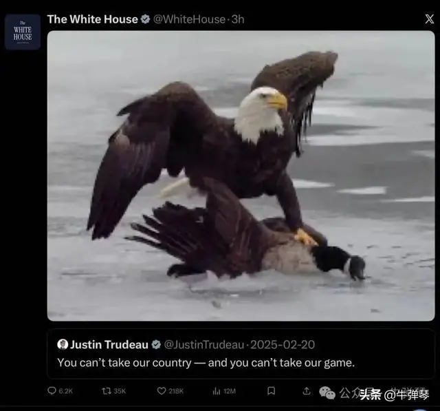 哪知道,白宫突然贴出一张图,图中,凶悍的白头鹰猛扑加拿大鹅,可怜的大鹅,被踩在脚底。