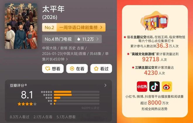 這個春節假期,被《太平年》點燃了對伍代拾國熱的劇迷朋友們,直奔浙江來見證這段歷史最鮮活的實景載體,而這裡也是宋韻文化的重要發源地。從伍條吳越國文化主題新春線路到“跟著《太平年》游杭州”主題公交和定制專線,游客們在行走中品讀千年文脈,解鎖獨壹無贰的年味記憶。據悉,吳越文化旅游線”累計客流量達到92718人次。小紅書、微博、抖音等平台播放量和閱讀量超過8000萬次,形成全網熱議態勢。