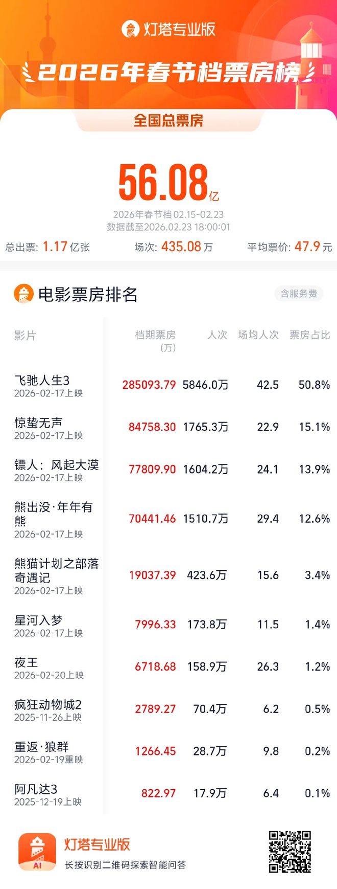 作为“史上最长春节档”,2026年春节假期(2月15日—2月23日)长达9天。据大麦娱乐旗下灯塔专业版数据,截至2月23日18时,2026年春节档总票房突破56.08亿,总场次435.08万场,总人次1.17亿,平均票价47.9元,总场次大幅刷新中国影史春节档总场次最高纪录,平均票价较去年春节档的50.8元大幅下调接近3元。