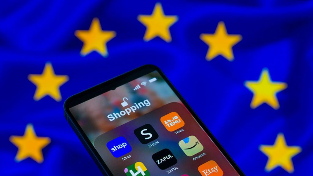 這張攝於2025年11月8日的設計圖片中,壹部手機顯示著Shein等電商平台的應用程式,而背景則可看到歐盟旗幟。(Getty)