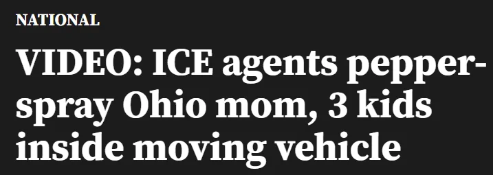 俄亥俄州哥伦布市的一名母亲要求对两名移民(专题)与海关执法局(ICE)特工展开调查,原因是这两名特工将胡椒喷雾喷入了她敞开的车窗,导致她和车内的三名孩子受到伤害。