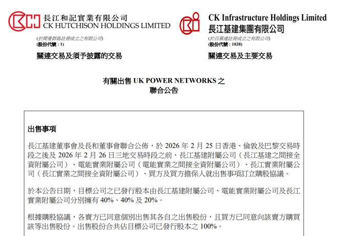 先看數字,根據長江基建、電能實業與長實集團聯合公告,叁方將所持英國電網100%股權,整體出售予法國能源巨頭Engie。多少錢呢?長江基建、電能實業各持股40%,分別套現約443億港元,長實集團持股20%,套現約221.5億港元,合計1107.5億港元。