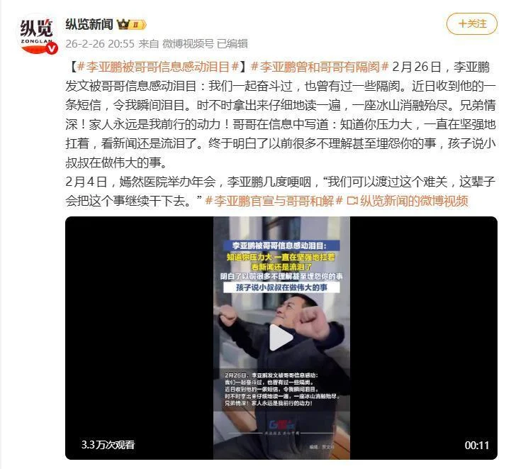 李亚鹏晒哥哥千字和解长文 官宣与哥哥和解