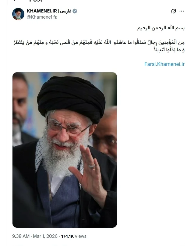 伊朗(专题)官方媒体证实最高领袖哈梅内伊身亡后,哈梅内伊的官方社交媒体发帖。