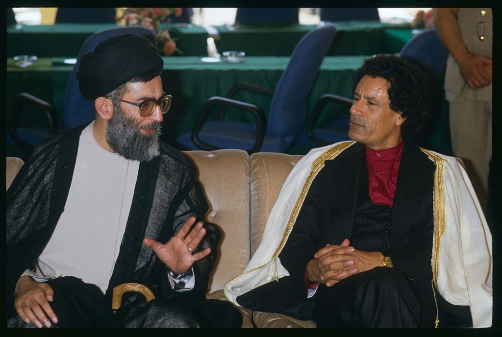 1996年9月,已故利比亚强人卡达菲和时任伊朗总统的哈梅内伊在第八届不结盟运动首脑会议上谈话。为了在冷战后重申其政治话语权,不结盟运动成员国每三年举行一次峰会。(Getty)