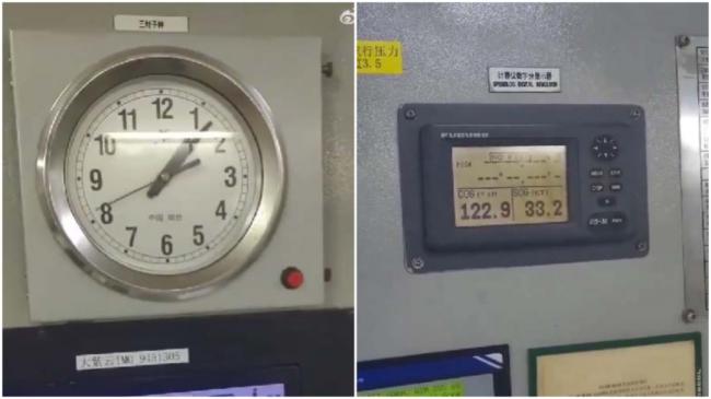 视频显示,驾驶舱内电子时钟飞转,秒针短短几秒钟内就转了一圈。拍摄视频的船员介绍,GPS信号都乱了,仪表盘上显示的船速剧烈变动。