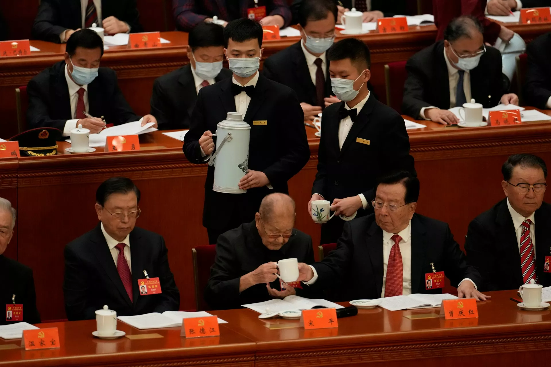 10月16日,北京,105岁前中共政治局常委宋平出席二十大,他饮茶时前国家副主席曾庆红伸手扶稳茶杯。(资料图片)