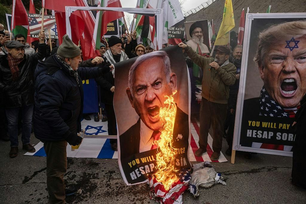 美以对伊朗展开军事打击,2026年2月1日,在土耳其伊斯坦堡一场伊朗亲政府集会上,示威者在美国领事馆外焚烧美国总统特朗普和以色列(专题)总理内塔尼亚胡的照片。(Getty)