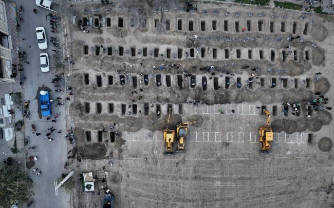 2月28日空襲中喪生的兒童和老師下葬前,工作人員操作挖掘機在伊朗米納卜的壹處墓地挖了近100座墳墓。 Iran's Foreign Media Department, via Associated Press