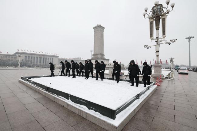 2026年3月5日,中共人大会议开幕前,保安人员用探测装置检查人民大会堂外一个积雪的花坛。(Lintao Zhang/Getty Images)