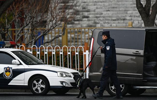 2026年3月5日,警察牵着狗在北京天安门广场周边的街道上巡逻。(Pedro Pardo/AFP via Getty Images)
