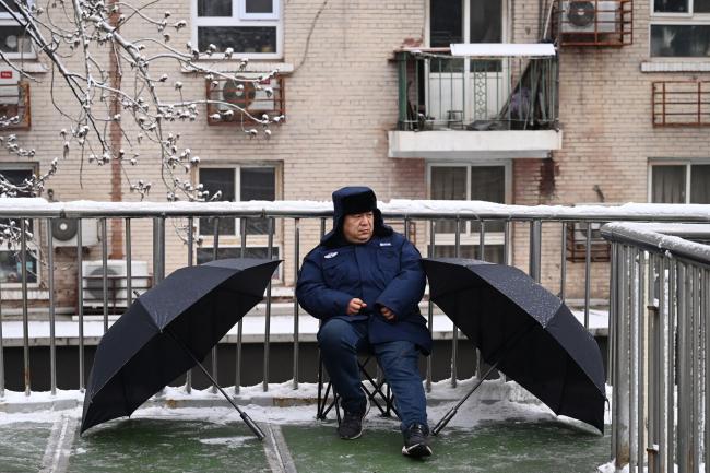 2026年3月4日,北京天安门广场周边街道上站岗的中共武警。(Pedro Pardo/AFP via Getty Images)