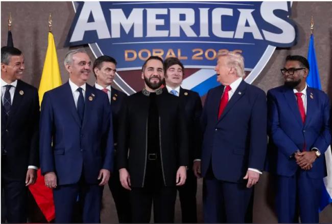 川普總統(右贰)7日在佛州舉行的“美洲之盾”(Shield of the Americas)峰會與多名出席的拉美國家領導人合影。(美聯社)