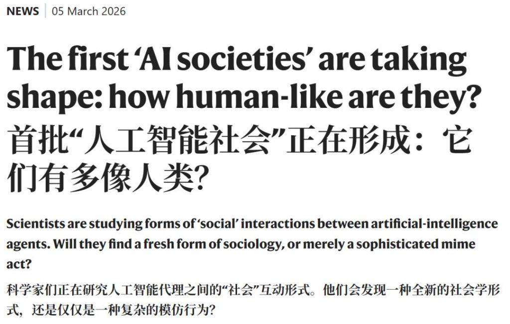 3月5日,Nature的壹篇社論文章就在追蹤這種「AI社會」萌芽。