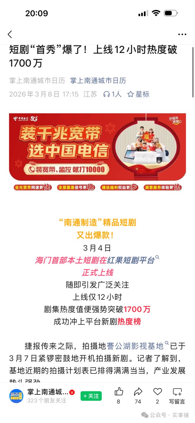 昨天,有南通地方媒體報道;“南通制造”精品短劇又出爆款!海門首部本土短劇在紅果短劇平台正式上線,上線僅12小時,劇集熱度值便強勢突破1700萬,成功沖上平台新劇熱度榜。