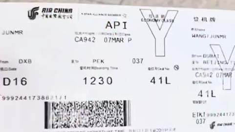 機票顯示,該航班是中國航空(Air China)的“CA942”航班,3月7日從迪拜飛北京。