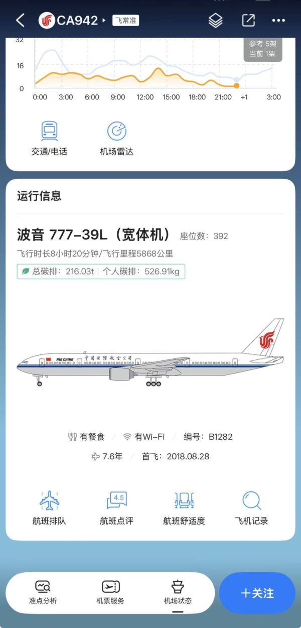 網民翻查航班信息發現,“CA942”航班壹直由波音飛機執飛。