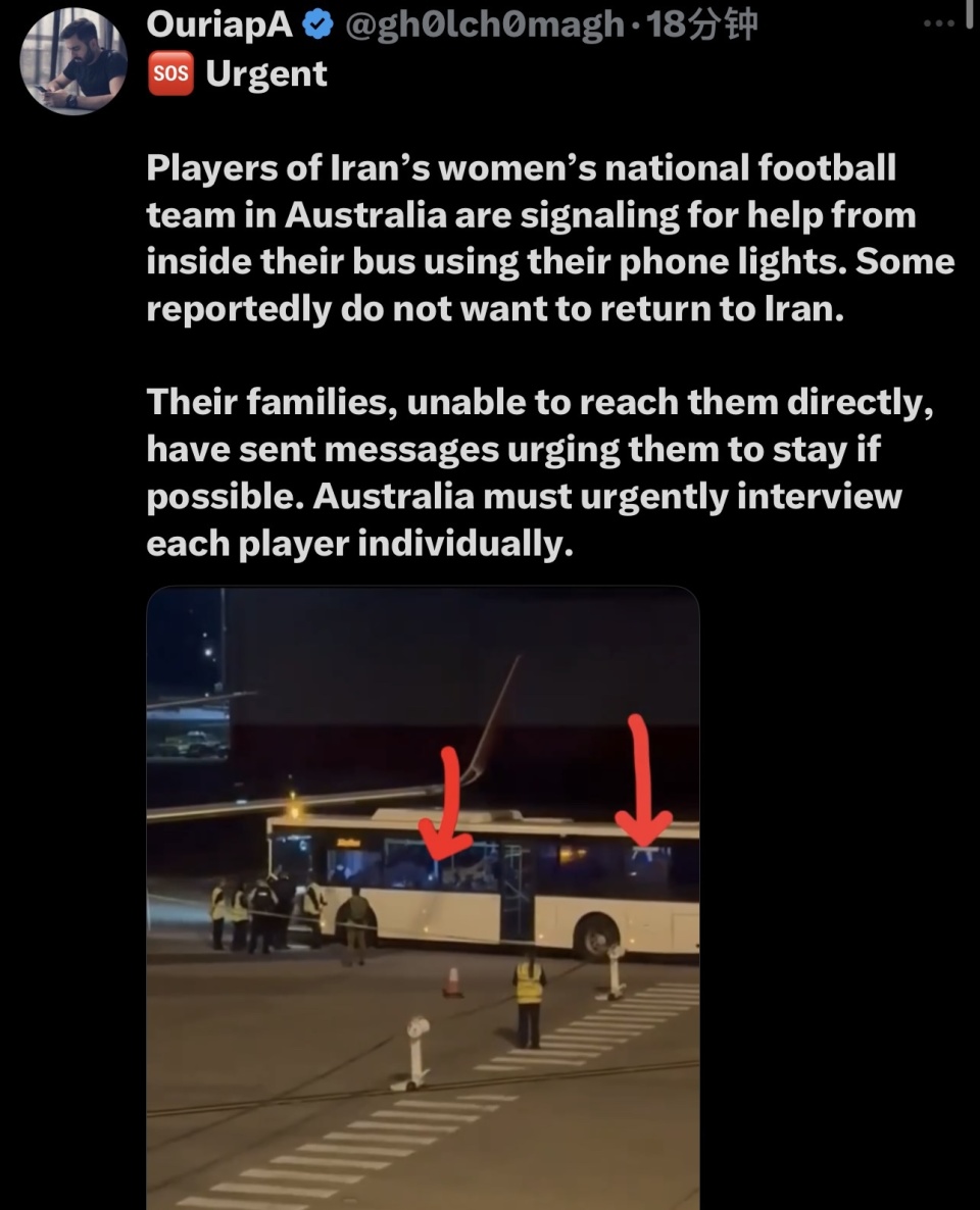 当地时间傍晚,伊朗女足乘坐的飞机在悉尼机场降落。而从社媒曝光的视频来看,球员们目前被要求待在大巴车内,不能离开,疑似有人通过手机闪光灯向外发出求救信号。