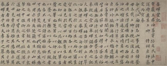 《春晖堂记》卷,元,欧阳玄书,《春晖堂记》是欧阳玄为王伯善的“奉亲之堂”所撰并书的记文。文中赞扬了王伯善对母亲的孝敬,同时又歌颂了王母的贤惠。从文中可知,此奉亲之堂名“春晖”,是当时的文人吴养浩据唐孟郊“谁言寸草心,报得三春晖”的诗意而起。来源/故宫博物院
