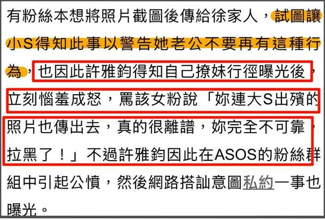 而得知照片泄露後,許雅鈞怒罵泄露照片的粉絲不靠譜。
