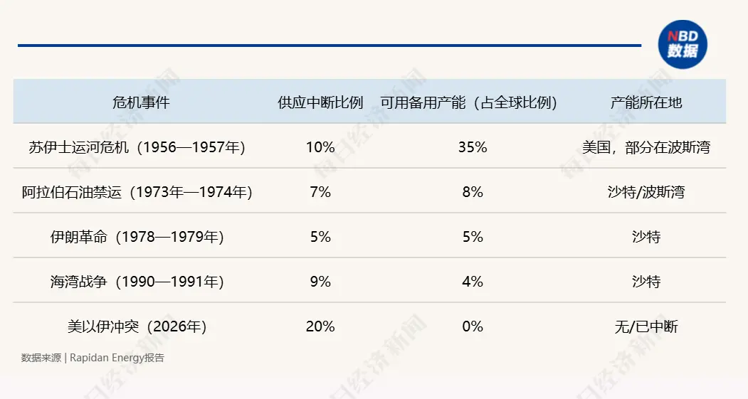 拉皮丹能源(Rapidan Energy)的分析师指出,本轮冲突前,最严重的石油供应中断发生在1956年苏伊士危机期间,当时全球约10%的石油供应受到影响。而这一次的断供规模是苏伊士危机的两倍,是1973年OAPEC石油禁运冲击的约三倍。