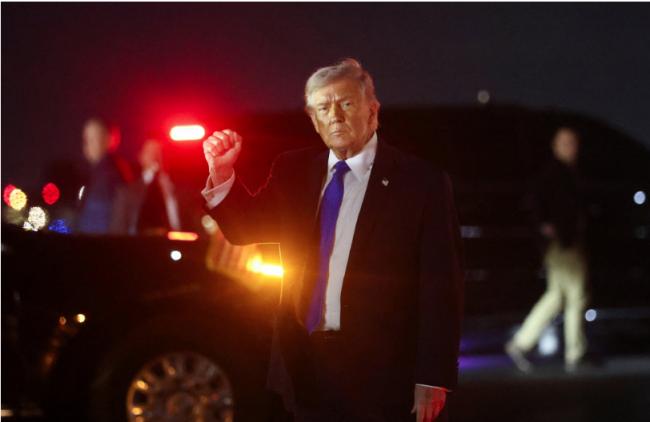 美国总统川普13日搭乘空军一号抵达佛州棕榈滩机场之后下机,面对媒体做出握拳手势。(路透)