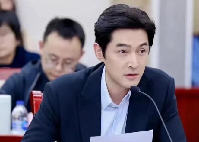 与荧幕中一贯精致考究的形象截然不同,此刻的他眉骨处那道清晰可见的印记格外引人注目;一袭深灰调中山装挺括有型,肩线分明、立领端方,举手投足间透出沉稳内敛的体制内干部气质。