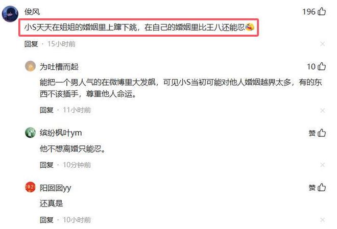 网友如此评论:小S天天在姐姐的婚姻里上蹿下跳,在自己的婚姻里,比什么都能忍。
