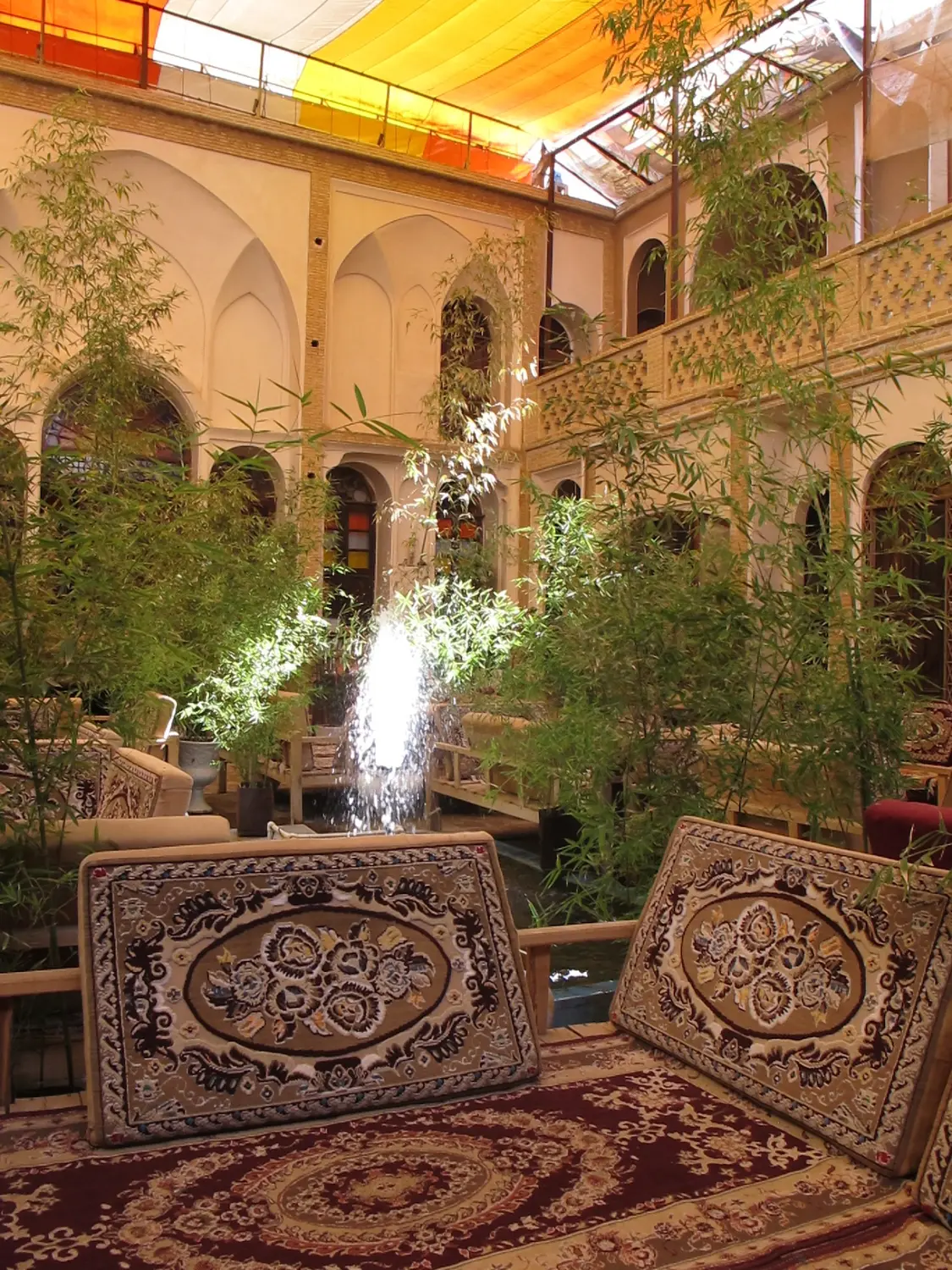 这种设计直接影响到传统建筑布局。在伊朗,宫殿、大宅、旅店等等,一般都在一处处庭院当中设有水池,围绕着水池,是类似“四合院”的围合式厅堂房舍,大小花园也都是以水池为中心。最妙的是,豪华宅邸内,会修造一至若干处半地下室,室内正中有一方水池,甚至有一座喷泉,摆上床榻和家具,到炎热的日子,人们便在这些地下室内消夏。伊朗人还进一步发明了“风塔”,在居室一角的暗渠之上砌高塔,塔顶部分有漏空的窄窗口,于是,热风通过那些窗口下沉,顺着水渠涌到室内,过程中由水降温,形成类似空调的效果。