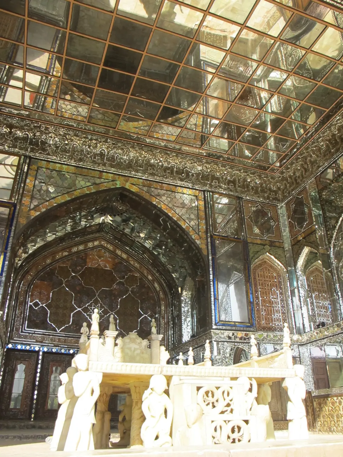 最有趣的是,伊朗人把欧洲的玻璃镜加以充分运用,将玻璃镜割成无数小片,贴在室内的墙壁和天花板上。王宫、大清真寺以及一些豪宅竟用玻璃镜片把穹顶内面、墙壁、柱体、天花板贴满,形成一座又一座镜光璀璨的大厅。有些高大空间更在穹顶里堆满层层花拱,再贴上镜片,迷离闪烁,真如水晶宫落到人间。